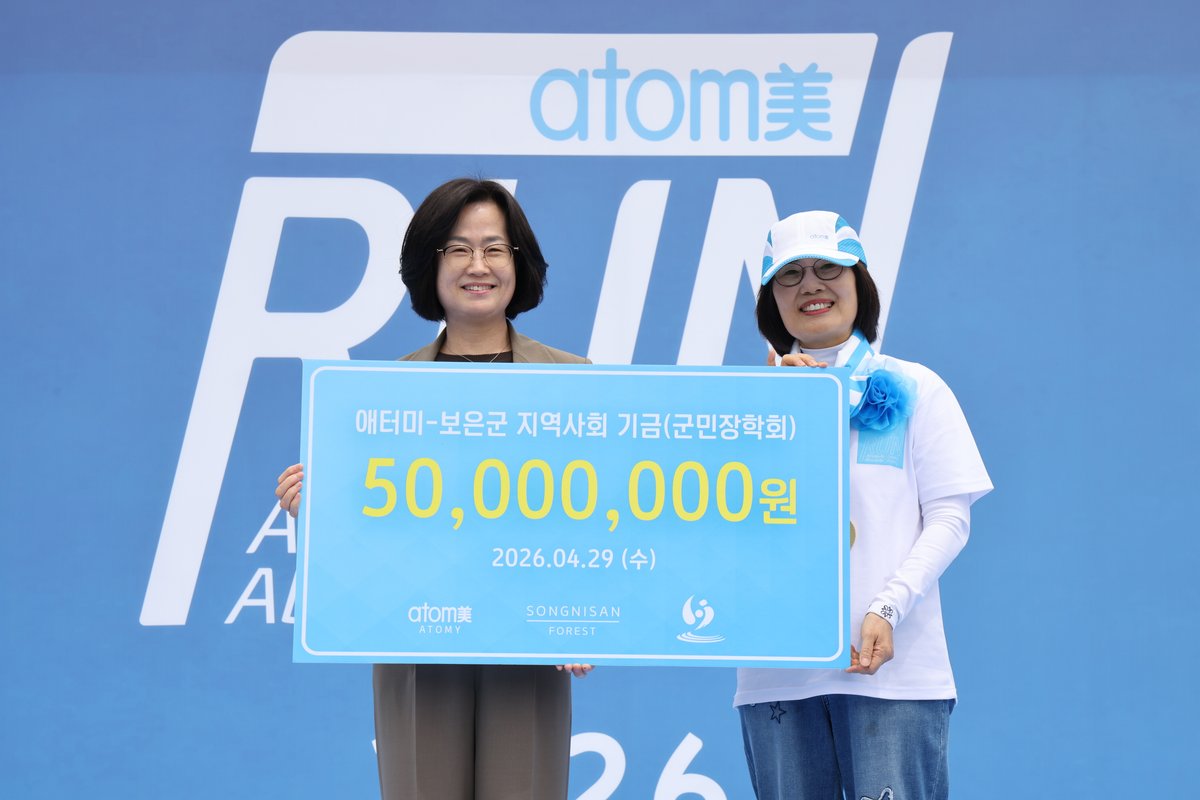 [충청뉴스큐] 충북 보은군은 29일 속리산 포레스트에서 열린 ‘2026 애터미 런’행사장에서 애터미가 지역 인재 육성을 위한 장학금 5000만원을 기탁했다고 밝혔다.