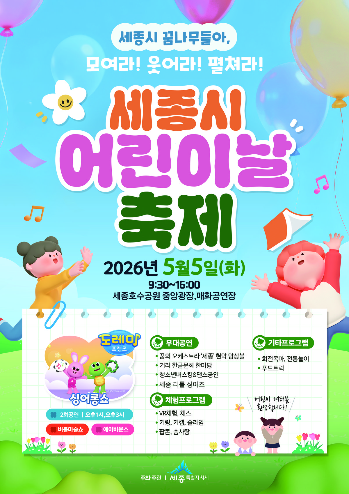[충청뉴스큐] 세종시가 오는 5월 5일 어린이날 세종호수공원 일원에서 ‘제104회 세종 어린이날 행사’를 개최한다.