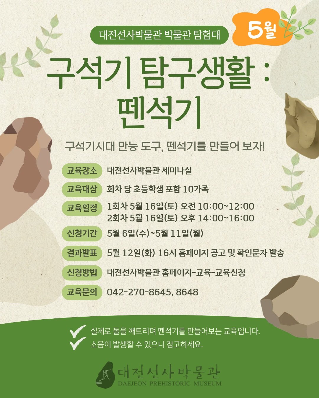 5월 16일에는 전문가와 함께 구석기 시대의 생존 기술을 배워보는 ‘구석기 탐구생활’ 이 오전, 오후 2회차에 걸쳐 진행된다.