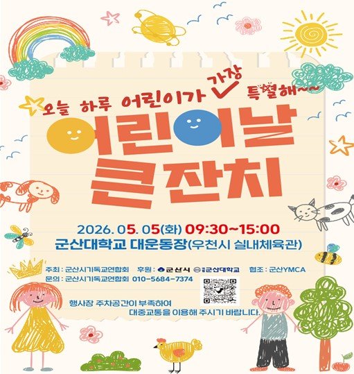 [충청뉴스큐] 군산시는 5월 5일 어린이날을 맞아 지역 어린이와 가족들을 위한 다채로운 행사를 월명실내체육관과 군산대학교에서 동시에 개최한다.