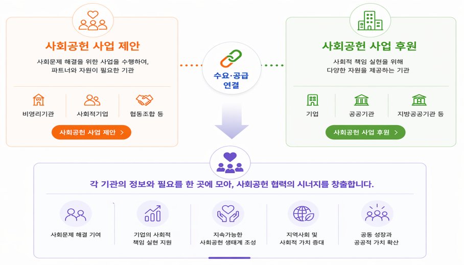 지역사회·비영리단체·소셜벤처 등 수행기관은 수행하는 사업과 필요한 자원을 등록해 기업과의 협력 기회를 확보할 수 있다. 이를 통해 기존의 개별 접촉 중심 구조에서 벗어나 보다 효율적으로 협력 기업을 찾고 사업을 추진할 수 있다.