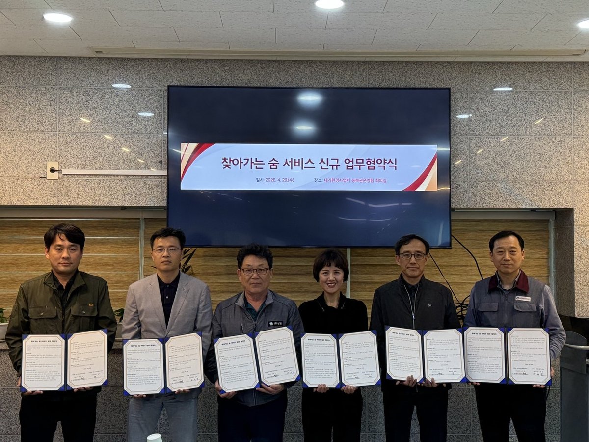 [충청뉴스큐] 대구공공시설관리공단은 지난 4월 29일 공단 대기환경사업처에서 대구 시민의 맑은 숨 권리 보장을 위해 칠곡공작한양아파트 외 3개 아파트와 ‘찾아가는 숨 서비스’업무협약을 체결했다.