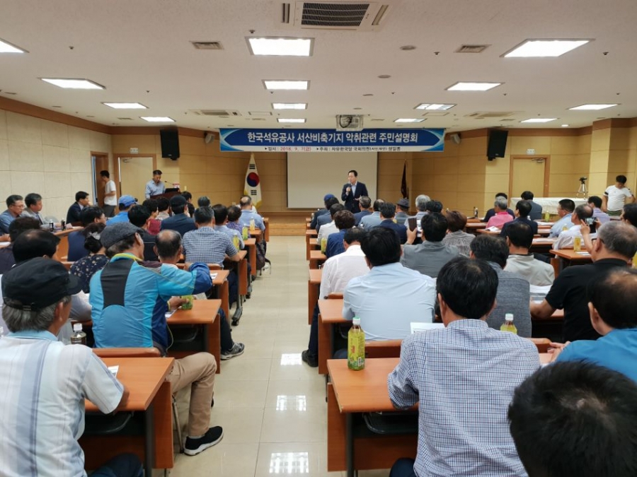 자유한국당 성일종 국회의원(충남 서산·태안)은 지난 7일 대산 농협 2층에서 대산지역 악취 및 대기오염 문제 해결을 위한 주민설명회를 개최했다. 지난해부터 대산공단 주변에서 악취가 심하다는 민원이 수차례 관련 기관에 접수돼 왔으나, 그 원인을 찾지 못해 해결책을 마련하지 못하고 있었다. 그러던 중 지난 8월 18일(토) 성 의원은 대산지역 주민들과 면담자리에서 석유공사가 관리하는 비축기지 근처에서 특히 악취가 심하다는 제보를 받았다. 환경공학박사로 환경 전문가인 성 의원은 사태의 심각성을 인식하고 주말 저녁임에도 즉시 현장을 방문해 저장탱크의 원유에서 발생한 유증기 누출이 그 원인이라는 것을 밝혀냈다. 석유공사는 지난해부터 한화토탈이 수입한 이란산 컨덴세이트 보관을 위해 저장탱크를 임대해 줬고, 원유 보관 과정에서 유증기가 발생해 유출된 것이다. 이란산 컨덴세이트는 초경질원유라서 낮은 온도에서도 유증기가 많이 발생하는 것으로 알려졌는데, 올 여름 기록적인 폭염으로 저장탱크의 온도가 올라가자 다량의 유증기가 발생해 유출량이 많아지면 악취가 심했던 것으로 파악됐다. 이후 성 의원은 8월 21일(월) 석유공사 사장과 담당자들을 국회로 불러 경과보고를 받는 자리에서 “국민의 건강이 최우선인 만큼 근본적인 해결책을 마련하지 못할 경우 비축기지 이전이나 폐쇄까지 검토하라”며, “악취로 인해 주민들의 건강에 이상이 있을 수 있으니 유증기의 위해성 평가도 실시하라”고 지시했다. 그 결과 석유공사는 3차에 걸친 국회 보고를 통해 긴급 대책 및 중장기 로드맵을 마련했다. 긴급 대책으로는 유증기가 누출될 가능성이 있는 배출통로의 커버를 설치하고 저장탱크의 온도를 낮추는 복사열 차단설비를 구축하고 악취 및 휘발성 유기화합물을 전문기관에 의뢰해서 분기1회씩 측정하기로 했다. 중장기적으로는 지름이 98m에 달하는 저장탱크에 알루미늄 돔을 씌워 유증기를 채집하는 방법으로 용역결과에 따라 설치할 계획이다. 석유공사 문병찬 비축사업본부장은 “악취로 주민 여러분의 불편을 끼쳐드려 죄송하고 재발 방지를 위해 최선을 다하겠다”고 사과했다. 대산읍 오지리에 거주하는 황 모씨는 성 의원에게 "공기업뿐 아니라 대산공단에 입주한 모든 기업들을 불러 환경오염의 원인과 대책을 마련해 줄 것"을 건의했다. 이날 주민설명회에는 대산 이장단협의회, 대산발전협의회, 상생협의회 등 대산지역 주민들과 입주기업 임직원 등 200여명이 참석했다.