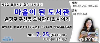 [충청뉴스큐] 평택시는 오는 25일 오후 7시부터 8시30분까지 시청 대회의실에서 ‘마을이 된 도서관’ 이라는 주제로 제2회 협치아카데미를 개최한다고 밝혔다.