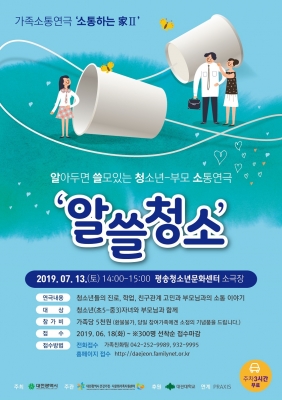 [충청뉴스큐] 대전시는 관내 거주 청소년과 부모를 대상으로 오는 13일 오후 2시 평송청소년문화센터 소극장에서 가족소통 연극‘소통하는 家Ⅱ-알아두면 쓸모 있는 청소년-부모 소통연극’를 개최한다.