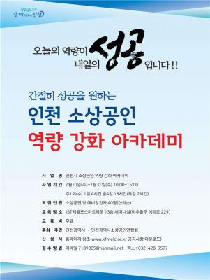 [충청뉴스큐] 인천광역시는 인천지역 소상공인과 창업을 준비하는 시민을 대상으로 경쟁력 있는 소상공인을 육성하고자 10일부터 4주에 걸쳐 아카데미를 운영한다고 밝혔다.