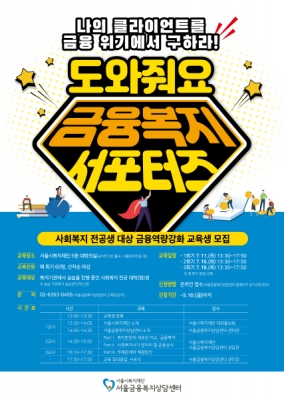 [충청뉴스큐] 서울시복지재단內 서울금융복지상담센터는 11일부터 3회에 걸쳐 ‘나의 클라이언트를 금융위기에서 구하라’를 주제로 복지관 하계 실습생에게 금융역량 강화를 골자로 한 금융복지 교육을 진행한다고 밝혔다.