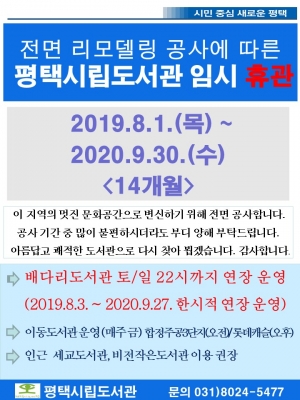 [충청뉴스큐] 평택시립도서관이 노후화된 시설 리모델링을 위해 오는 8월 1일부터 임시 휴관에 들어간다. 이는 평택시가 리모델링을 위한 사업비를 확보하고 올해 경기도 노후 도서관 리모델링 공모사업 및 특별조정교부금을 지원 받아 추진하는 사업이다.