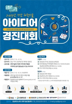 [충청뉴스큐] 경상남도가 과학기술과 접목가능한 지역의 다양한 문제를 해결하고 지역의 과학문화를 더욱 확산시키고자 경남테크노파크, 경상남도의회, 경상남도교육청과 협력해 ‘2019년 과학기술아이디어 경진대회’를 개최한다.