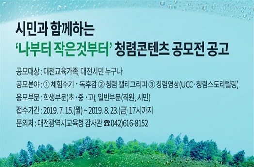 대전광역시교육청(교육감 설동호)은 청렴문화 확산을 위하여 ‘시민과 함께하는 ‘나부터 작은 것부터’ 청렴콘텐츠 공모전‘를 연다고 밝혔다. 이번 공모전은 7월 15일부터 8월 23일까지 학생과 일반 응모부분으로 대전 시민 누구나 참여 가능하며, 분야는 ▲청렴체험수기·독후감 ▲청렴 캘리그라피 ▲청렴영상(UCC, 청렴스토리텔링)으로 다양한 분야의 콘텐츠를 공모·발굴하여 청렴 교육 및 홍보에 활용할 예정이다. 일상 생활 속에서 경험하여 함께 실천할 수 있는 청렴 및 양심 관련 사연을 체험수기·독후감으로 작성하거나 참신하고 기발한 아이디어를 담은 청렴 영상 UCC 제작, 강연 또는 토크쇼 등 말로 전달하는 청렴 스토리텔링 형식으로 제작하여 감사관실로 응모하면 된다. 또한 청렴 캘리그라피 작품은 청렴을 알릴 수 있는 자유 문구를 우편으로 제출하면 된다. 자세한 사항은 대전교육청 홈페이지에서 확인 가능하며, 접수된 작품은 공정한 심사를 거쳐 학생·일반 응모 부분별 대상 등 각각 10편의 우수 작품을 선정하고 9월 초에 시상 할 예정이고, 또한 우수 작품은 미래교육박람회에 전시하고 청렴 자료 등으로 제작 할 예정이다. 대전교육청 류춘열 감사관은 “이번 공모전이 ‘나부터 작은 것부터’ 실천하는 청렴 문화 조성을 위해 평소 청렴에 대한 관심을 가진 교육 가족과 대전 시민이 청렴 콘텐츠 제작에 직접 참여하여 다양하게 표현하는 기회가 되길 바라며, 그를 통해 청렴문화가 확산·정착될 수 있기를 기대한다”고 말했다.