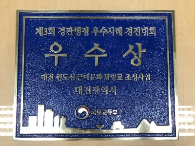 [충청뉴스큐] 대전시는 국토부 주관으로 시행한 제3회 경관행정 우수사례 경진대회에서‘원도심 근대문화탐방로 조성사업’이‘우수상’을 수상했다고 15일 밝혔다.