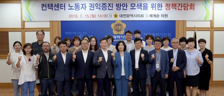 대전광역시의회 채계순의원(더불어민주당, 비례대표)은 15일 대전시의회 대회의실에서 직접 전화상담 업무를 맡고 있는 콜센터 감정노동자들로부터 컨택센터 현장에서 겪는 생생한 고충과 어려움을 듣고자‘컨택센터 노동자 권익증진 방안 모색을 위한 정책 간담회’를 개최했다. 콜센터 노동자들은 반복적이면서 악의적인 민원고객으로부터 인격 비하, 폭언·욕설, 성희롱 등을 지속적으로 받고 있으며, 회사 내부적으로는 고강도의 실적 압박과 인권 침해적인 평가시스템, 피해 상담사 보호체계 부족 등으로부터 오는 어려움을 호소했다. 토론자들은 우리나라 콜센터 상담사들은 여성, 비정규직, 저임금의 특성을 지닌 대표적 취약 노동계층이라면서 이들을 보호하기 위해서는 감정노동을 심화시키는 주요 원인인 악성소비자 대응 부족, 고객위주의 판단, 상담사들에 대한 심리적·육체적 건강관리 투자 부족 등을 해결하는데 노력을 기울여야 한다고 한 목소리를 냈다. 아울러 상담사들을 위한 적정한 휴식시간 보장, 고객 응대 매뉴얼 활용, 고충처리 창구 운영, 직무교육 및 상담 프로그램 운영, 감정노동자 보호에 대한 고객 공감 확산 등이 이뤄져야 한다고 주장했다. 이에 간담회를 주관한 채계순 의원은 “대표적 취약 노동분야로 알려져 있는 감정노동자들이 악성 고객으로부터 보호받기 위해서는 적절한 대응 매뉴얼 및 악성 고객에 대한 법적 처벌 근거 마련, 원청에 대한 감정노동자 보호 조치 강화 요구 등 법적·제도적으로 감정노동자를 보호할 수 있는 방안이 공공분야 차원에서 적극 모색되어야 한다”며 “시의회 차원에서 다양한 정책 등을 마련해 나가겠다”고 강조했다.