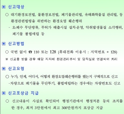 특히 '환경오염행위 신고창구'를 집중 운영하여 국민 누구나 환경오염행위를 발견하면 국번없이 110 또는 128로 전화하여 신고하도록 했다.