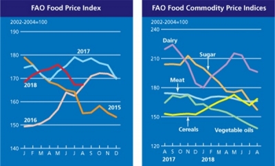 [충청뉴스큐] 유엔식량농업기구 에 따르면, 2018년 8월 세계식량가격지수는 전월(167.2포인트) 수준과 비슷한 167.6포인트를 기록했다.