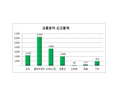 분야별 신고건수는 교통분야가 1만 5,426건으로 가장 많았고, 내역별로는 불법주정차 6,264건, 도로 3,697건, 보도 2,228건, 공중선 1,998건 순으로 나타났다.