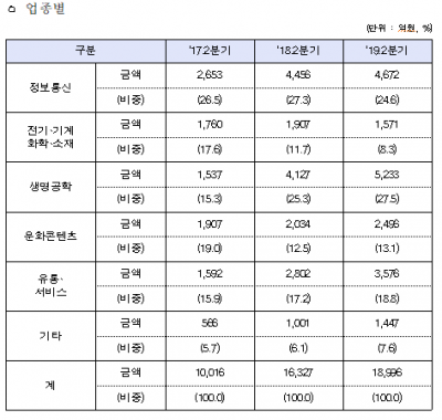 업종별로는, 4차 산업혁명 분야에 대한 관심이 높아지면서 전체 투자금액 중 생명공학 27.5%, 정보통신 24.6%를 차지했다.