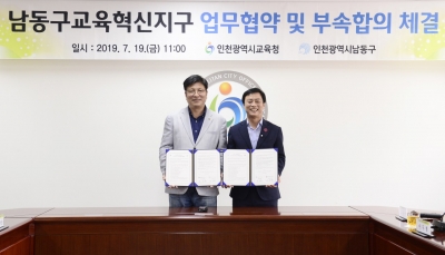 [충청뉴스큐] 인천광역시교육청과 남동구는 19일 인천광역시교육청 영상회의실에서 남동구 교육혁신지구 업무협약 및 부속합의를 체결했다.