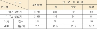 이는 지난 2017년 상반기 2,989건보다 224건(7.5%) 증가 했고, 인명피해도 135명(사망24명, 부상 111명)보다 66명이(48.9%) 증가했다.