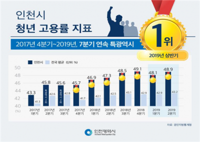 [충청뉴스큐] 인천시가 2019년 상반기에도 청년고용률 전국 특·광역시 1위를 달성, 2017년 4분기부터 7분기 연속 특·광역시 1위를 차지했다.