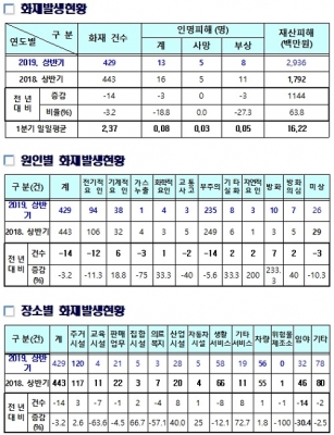 화재는 하루평균 2.37건 총 429건 발생해 전년 443건 대비 3.2% 줄고 13명의 인명피해와 29억여 원의 재산피해가 발생했다.