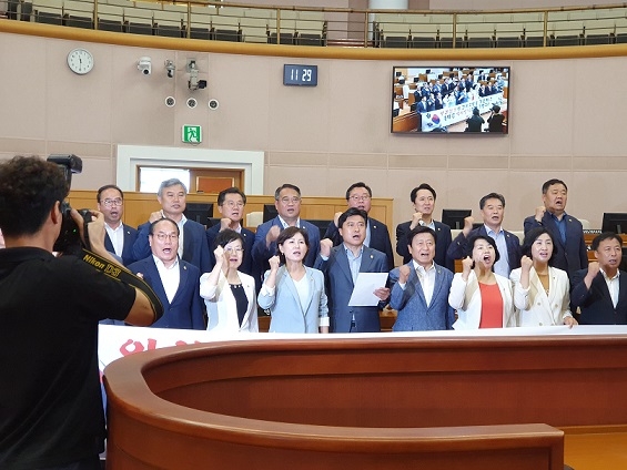 대전광역시의회(의장 김종천)는 24일 제244차 임시회 제2차 본회의 후 일본 아베정부의 경제도발 조치를 규탄하는 결의대회를 개최했다. 현재, 아베 정부는 지난 1일부터 우리나라 대법원의 일제 강점기 강제징용 피해자들에 대한 손해배상에 대한 보복조치로 반도체, 디스플레이 등의 제조에 필수적인 부품 및 소재의 수출 규제를 강화하는 등 국제사회의 자유롭고 공정한 무역원칙을 위반하며 우리나라에 대한 경제적 제재를 자행하고 있다. 이에 김종천 의장은 “일본 아베 정부의 경제도발을 규탄하며, 일본의 올바른 역사인식을 거듭 촉구한다”면서 일본 아베정부의 수출규제 조치 즉각 철회와 일본 전범기업 피해자들에 대한 정당한 배상을 요구했다.