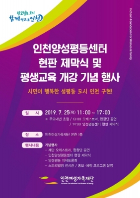 행사 진행은 11시부터 오후 5시까지 재단 본관 1층~2층에서 진행되었으며, 여성가족재단 오케스트라, 합창단 기념공연을 시작으로, 50+ 제2경력개발교육 프로그램 공모전 시상식, 인천양성평등센터 현판 제막식, 양성평등 의제토론회 등이 개최됐다.