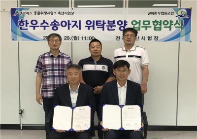 진안군 성수면 소재 전라북도 동물위생시험소 축산시험장은 29일 전북한우협동조합과 업무 협약식을 갖고 계획교배를 통해 생산된 우수 혈통의 한우 수송아지 13마리를 전북한우 협동조합을 통하여 위탁분양을 실시한다고 밝혔다.