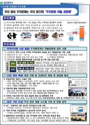 특히, 이번에 특·광역시에서 유일하게 국민공감 우수사례로 선정된‘우리 동네 주차문제는 우리 힘으로 주차문화 마을 공동체’는 점점 부족해지는 주차문제를 주민 스스로 지역문제에 관심을 갖고 협력하여 주차환경을 개선할 수 있도록 지원하고 주차공유 기반을 정착하는 사업으로 공유주차장을 늘리고 불법주정차를 줄이는데 기여했다.