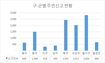 구·군별 주민신고 현황을 보면 달서구가 가장 많은 신고건수를 기록했다. 이어서 북구, 수성구 순으로 나타났다.