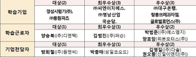 올해 학습기업 부분 대상은 우수 기업현장교사에게 인센티브를 제공하고, 기업현장교사와 학습근로자를 1:1매칭하여 현장훈련의 품질을 높인 경성시험기, 학습근로자의 훈련 성과를 인사·보상체계와 연계한 ㈜동원파츠가 수상했다.