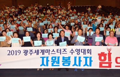 자원봉사자 600여명은 ‘자원봉사자 힘으로’라는 구호를 외치며 대회 성공개최를 다짐하고 마스터즈 수영선수권대회가 성공할 수 있도록 최선을 다하겠다고 결의하고 복무규칙과 근무요령 등의 소양교육을 받았다.