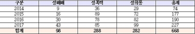 성비위로 징계 처분이 내려진 국가공무원은 2014년 74명에서 2015년 177명, 2016년 190명으로 매년 증가해왔다.