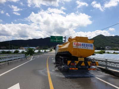 또한 폭염 장기화에 따른 폭염피해 예방을 최소화하기 위해서 복사열 저감대책으로 주민통행이 빈번한 주요도로에 살수차를 임차하여 쾌적한 도로 환경과 인명피해 예방을 위해 안전관리에 총력을 기울이고 있다.