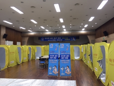 야간무더위쉼터로 운영되는 구청 대강당에는 냉방기기가 가동되는 가운데 대한적십자사로부터 대여한 재난구호용 텐트 29동을 비롯해 침구세트, 냉·온수기, TV 등의 시설이 갖춰져 있다.