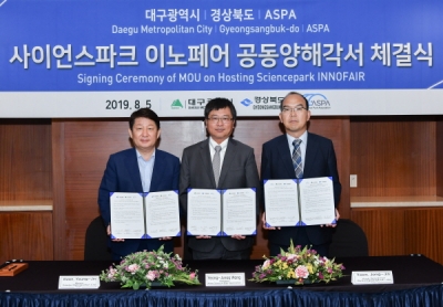 [충청뉴스큐] 경상북도는 대구시, 아시아사이언스파크협회와 내년 6월 대구 엑스코에서 개최되는‘2020 사이언스파크 이노페어’의 성공적인 개최를 위한 MOU를 체결했다고 밝혔다.