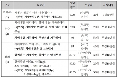 최우수상에는 최유미 씨의 ‘치매 안심 부산 잊음에서 채움으로’ 가, 우수상에는 김예원 씨의 ‘치매 예방 미리미리, 함께하는 안심 부산’과 김은숙 씨의 ‘치매 예방 퍼뜩 하이, 부산 건강 가득 하이’가 선정됐다.