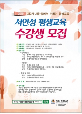 [충청뉴스큐] 안성시 평생학습관에서 ‘2019년 제2기 서안성 평생학습’ 수강생 125명을 모집한다.