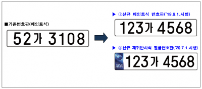 한편, 신규 번호체계 중 기존 번호판 크기의 7자리를 8자리로 변경한 현행 페인트식 번호판은 예정대로 오는 9월1일부터 시행하고, 함께 시행키로 한 태극문양, 위·변조방지 홀로그램 등 야간 시인성 기능이 추가된 재귀반사식 필름번호판은 기술적 문제로 내년 7월로 연기됐다.