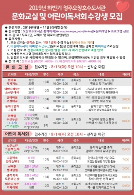 [충청뉴스큐] 청주오창호수도서관이 2019년도 하반기 문화교실 및 어린이독서회를 수강생을 모집한다.