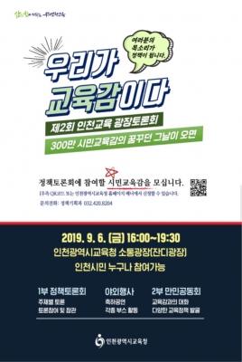 ‘우리가 교육감이다’라는 주제로 열리는 제2회 인천교육 광장토론회에서는 학생, 학부모, 교직원, 시민들이 16개 분야로 나누어 토론하고 그 결과를 교육 정책에 적극 반영할 예정이다.