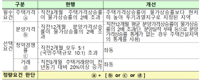 또한, 선택요건 중 하나인 분양가격상승률은 해당 시·군·구의 분양실적 등이 없어 활용되지 못하는 경우가 많아, 해당 시·군·구의 분양실적이 없는 경우에는 ‘주택공급에 관한 규칙’ 상 청약이 가능한 지역인 주택건설지역의 분양가격상승률을 사용토록 개선한다.