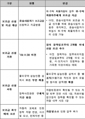 먼저, 그간 화물차의 경우 운송사업자만 보조금을 신청하고 지급 받을 수 있어 위·수탁 계약 차량은 신청이 미진하였는데, 이번 지침 변경으로 실질적 장착자인 위·수탁 화물차주가 보조금을 지급받을 수 있고, 보조금 신청도 운송사업자가 위임할 경우 위·수탁 화물차주가 직접 할 수 있게 됐다.