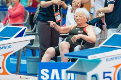 여자 자유형 100m에 참가한 90세 이상급이자 이번 대회 최고령자인 아마노 토시코씨는 출발신호와 함께 85~90세급의 젊은 두 선수와 물속으로 뛰어 들었다.