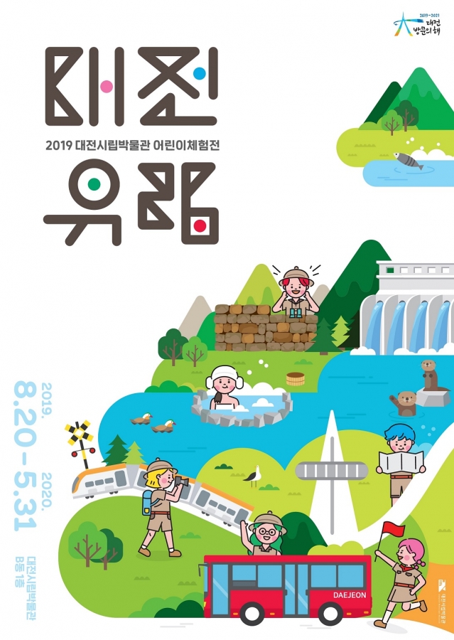 대전시립박물관은 오는 20일부터 내년 5월 31일까지 대전시립박물관 B동 1층에서 2019년 어린이체험전시 ‘대전유람 (大田遊覽)’을 선보인다. 이번 전시는 대전 방문의 해를 기념해 ‘대전의 산과 물, 도시로 유람을 떠나보자’를 주제로 어린이들이 대전에 대해 재미있게 놀면서 알아볼 수 있는 내용으로 기획됐으며 어린이들의 눈높이에 맞춘 다양한 시각자료와 체험물로 구성됐다. 전시는 ‘산’, ‘물’, ‘도시’ 총 3개의 테마로 나뉘어 있다. 우선 도입부에서‘대전 어디까지 가봤니?’라는 질문을 던지며 대전에 대해 얼마나 아는지 스스로에게 묻고 답하며 시작할 수 있도록 했다. 1부에서는 ‘산’을 주제로 대전을 둘러싸고 있는 산과 대전을 지켜주었던 ‘산성’들에 대해 알아보고, 2부에서는 ‘물’을 주제로 아름다운 풍경과 생태로 가볼만한 ‘대청호’와 관광도시로서 대전의 모습을 보여줄 수 있는‘유성온천’을 다룬다. 세 번째 테마는 ‘기차가 다니며 만들어진 대전’으로 우리나라 방방곡곡으로 뻗어나간 도로와 철도에 대해 알아보고, 현재까지 남겨진 근대 대전의 건물도 살펴볼 수 있는 공간으로 구성됐다. 이외에도 대전의 산, 물과 관련된 설화이야기들과 대전의 옛 풍경을 볼 수 있는 영상이 곳곳에 담겨 있으며, 마치 대전의 산과 물을 바라보며 소풍 온 것 같은 휴게 공간도 마련됐다. 대전시립박물관 관계자는 “이번 전시를 통해 우리 아름다운 대전을 재미있게 알아보고 즐기는 시간이 되길 바란다”고 말했다. 한편, 이번 전시 개막식는 20일 오전 10시 30분 열릴 예정이며, 입장료는 무료다. 이날 개막식에는 관람객들이 참여한 가운데 대전시립박물관 서포터즈 어린이합창단의 축하공연도 펼쳐진다.