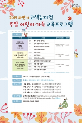[충청뉴스큐] 수원시 고색뉴지엄이 오는 9월부터 12월까지 ‘생태환경’과 ‘예술’을 주제로 한 ‘2019 하반기 주말 어린이·가족 교육 프로그램’을 운영한다.