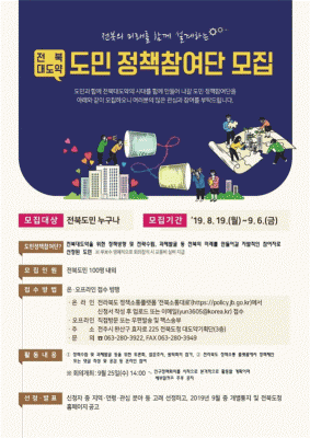 [충청뉴스큐] 전라북도가 도민과 함께 전북 대도약의 시대를 열어가기 위해 정책 수립과정 등에 직접 참여하는 ‘도민 정책참여단’을 모집한다고 밝혔다.