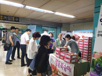 영동군은 지난 19일부터 20일까지 2일간 서울지하철 잠실역과 왕십리역에서 영동복숭아 직거래장터 판매·홍보 행사를 개최했다.