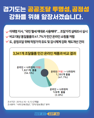 이신혜 과장은 “이번 공공조달 물품의 단가 비교 조사는 국민의 혈세를 제대로 사용해야 한다는 이재명 도지사의 도정운영 철학에 따른 것”이라면서 “민간 온라인쇼핑몰 대비 비정상적으로 높은 가격으로 판매되는 나라장터 물품에 대해서는 심층적 조사가 필요할 것으로 보인다. 나라장터 물품을 우선적으로 구매토록 한 관련제도 역시 개선될 필요가 있다”고 말했다.