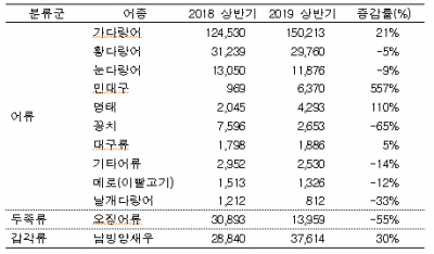 어종별로 살펴보면, 민대구, 명태, 남빙양새우, 가다랑어 등의 생산량이 전년에 비해 크게 증가한 반면, 꽁치, 오징어류, 눈다랑어, 황다랑어 등의 생산량은 감소했다.
