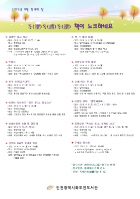 [충청뉴스큐] 인천광역시화도진도서관에서는 9월 ‘독서의 달’을 맞이하여 지역주민의 독서의욕 고취 및 문화향유기회 제공을 위하여 “독독독 책이 노크하네요”를 주제로 다양한 독서문화프로그램을 운영한다.